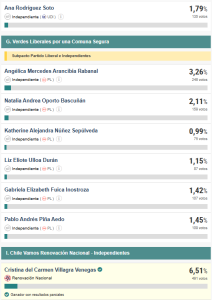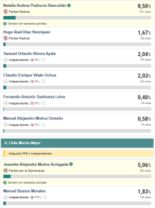 La actual concejala en ejercicio, Natalia Pedreros (PR) con un 8.50% sumando 641 votos, obtuvo la primera mayroía en las mesas recptoras de sufragios en las elecciones concluidas en la tarde de ayer domingo. La edil logro este triunfo electoral con la votación de Villa Tijeral, donde obtuvo 503 votos.